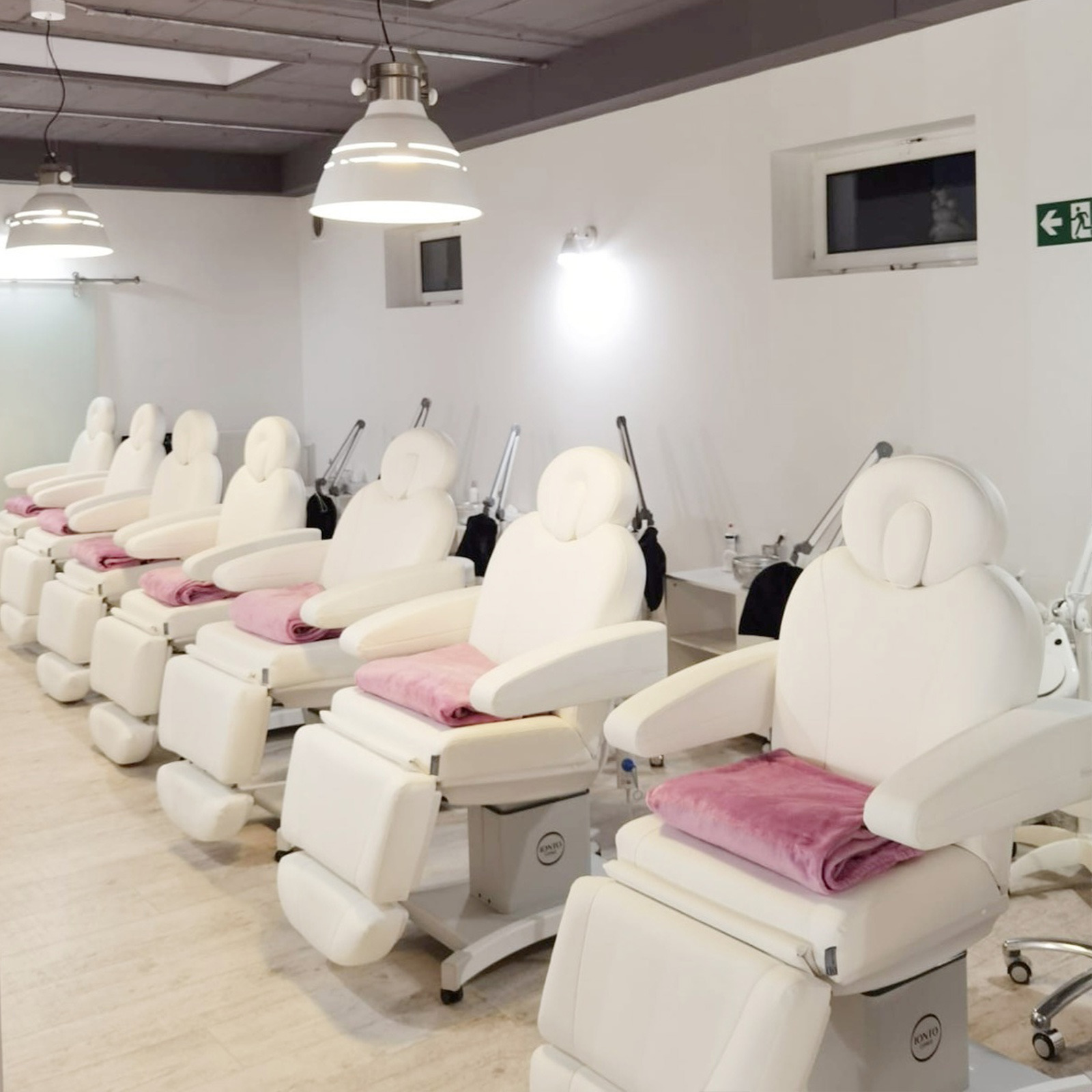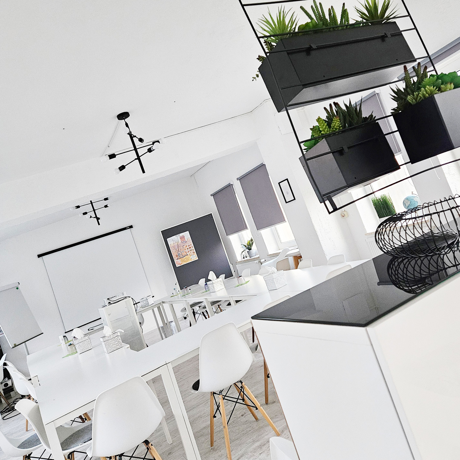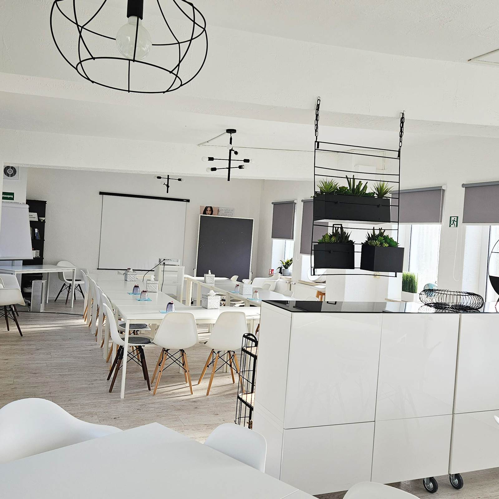 Das moderne und helle Ambiente unserer Akademie schafft eine angenehme Lernatmosphäre, die das Lernen erleichtert. In den Praxisräumen stehen beheizte Kosmetikliegen und modernste Gerätetechnologie zur Verfügung, um den Unterricht praxisnah zu gestalten. Professionelle Schminkplätze mit Tageslicht sorgen für optimale Bedingungen beim Arbeiten.Für entspannte Pausen bieten wir unseren Schülern eine gemütliche Lounge und eine kleine Küche. Der Theoriebereich ist mit einem interaktiven Whiteboard und Tablets ausgestattet, die modernste Maßstäbe für das Lernen setzen und den Unterricht interaktiv gestalten.